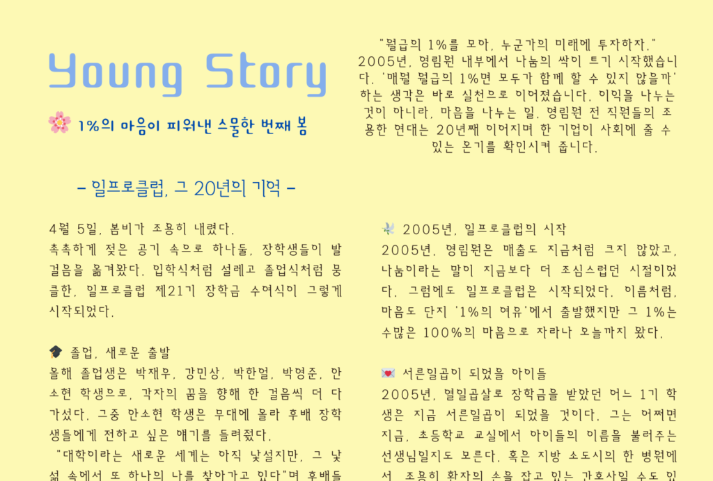 ‘증미역 이야기 맛집’이 문을 열었습니다. 영림원소프트랩의 문화 소식지 1호인 2025년 4월 ‘Young.April’ 에 담긴 [Young Story] 글입니다. 🌸 1%의 마음이 피워낸 스물한번째 봄 “월급의 1%를 모아, 누군가의 미래에 투자하자.”…