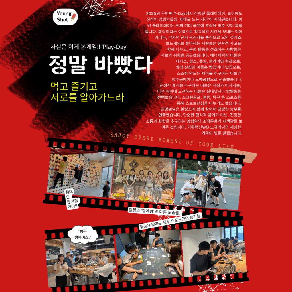 ‘증미역 이야기 맛집’이 네번째 이야기를 가져왔습니다. 영림원소프트랩의 문화 소식지 4호인 2025년 7월 ‘Young.July’ 에 담긴 [Young Shot] 코너입니다. 사실은 이게 본게임!! ‘Play-Day’ 먹고 즐기고 서로를 알아가느라 정말 바빴다 2025년 두번째…
