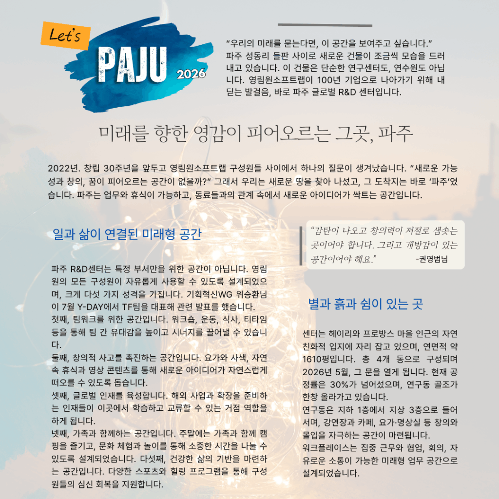 ‘증미역 이야기 맛집’이 네번째 이야기를 가져왔습니다. 영림원소프트랩의 문화 소식지 4호인 2025년 7월 ‘Young.July’ 에 담긴 [Let’s PAJU] 코너입니다. 미래를 향한 영감이 피어오르는 그곳, 파주 “우리의 미래를 묻는다면, 이 공간을 보여주고…