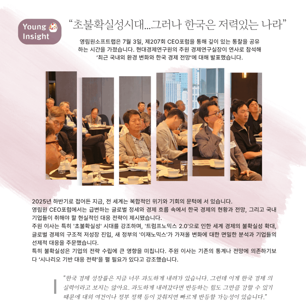 ‘증미역 이야기 맛집’이 네번째 이야기를 가져왔습니다. 영림원소프트랩의 문화 소식지 4호인 2025년 7월 ‘Young.July’ 에 담긴 [Young Insight] 글입니다. “초불확실성시대…그러나 한국은 저력있는 나라” 제207회 CEO포럼 2025년 하반기로 접어든 지금, 전 세계는…