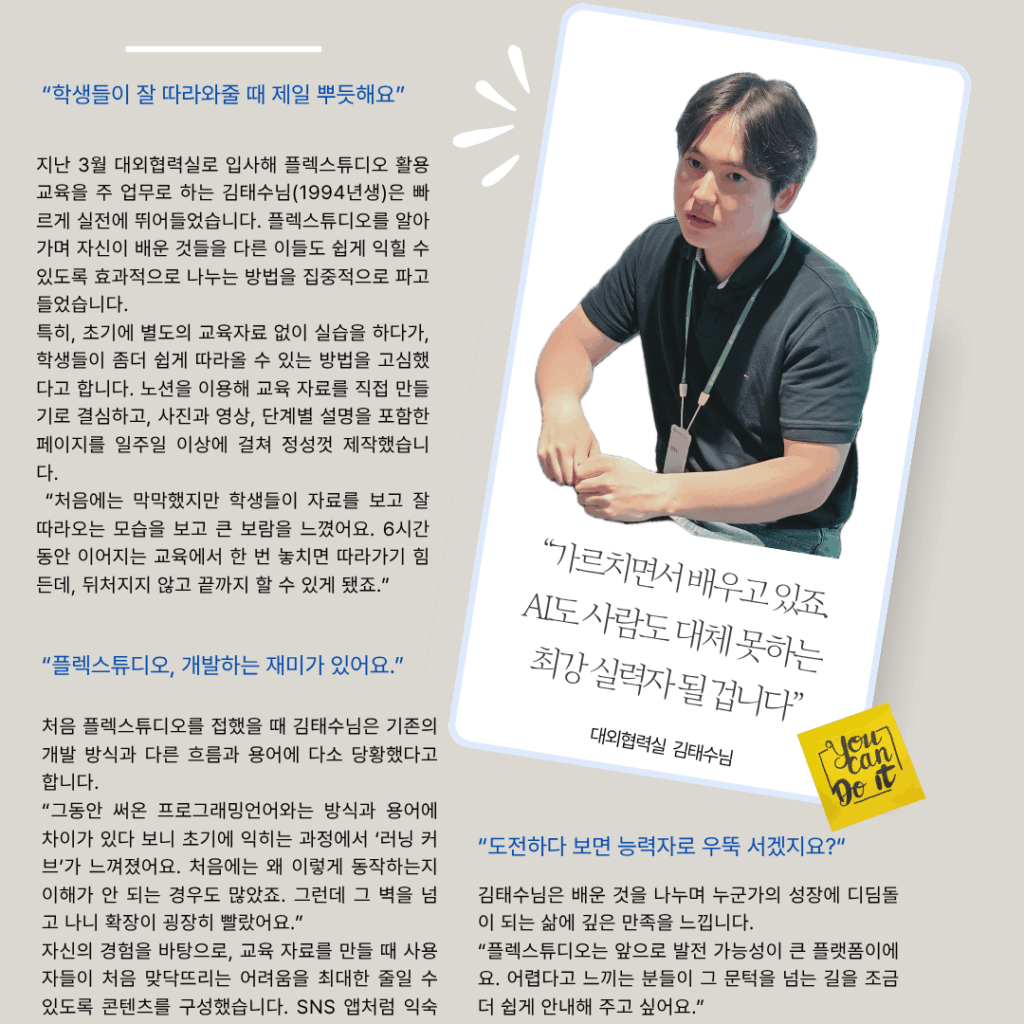 ‘증미역 이야기 맛집’이 네번째 이야기를 가져왔습니다. 영림원소프트랩의 문화 소식지 4호인 2025년 7월 ‘Young.July’ 에 담긴 [Young IDOL] 글입니다. “ AI도 사람도 대체 못하는 최강 실력자 될 겁니다” 김태수님은 누구보다 치열한 일상을…