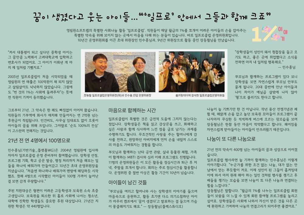 “커서 대통령이 되고 싶다던 중학생 아이는 그 꿈만큼 노력해서 고려대학교에 입학하고 변호사가 되었어요. 그 아이가 이뤄낸 게 마치 제 일처럼 기뻤지요.” 영림원소프트랩의 특별한 사회나눔 활동 ‘일프로클럽’. 직원들이 매달 월급의 1%를 쪼개어 어려운…