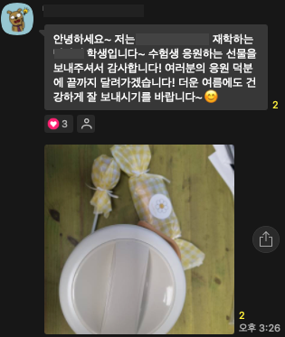 저희 일프로클럽에서는 얼마 전 18기부터 19기에 걸친 총 9명의 수능을 앞두고 있는 장학생들에게 격려 차 작은 응원이 담긴 손편지와 함께 선물을 전달하였습니다.