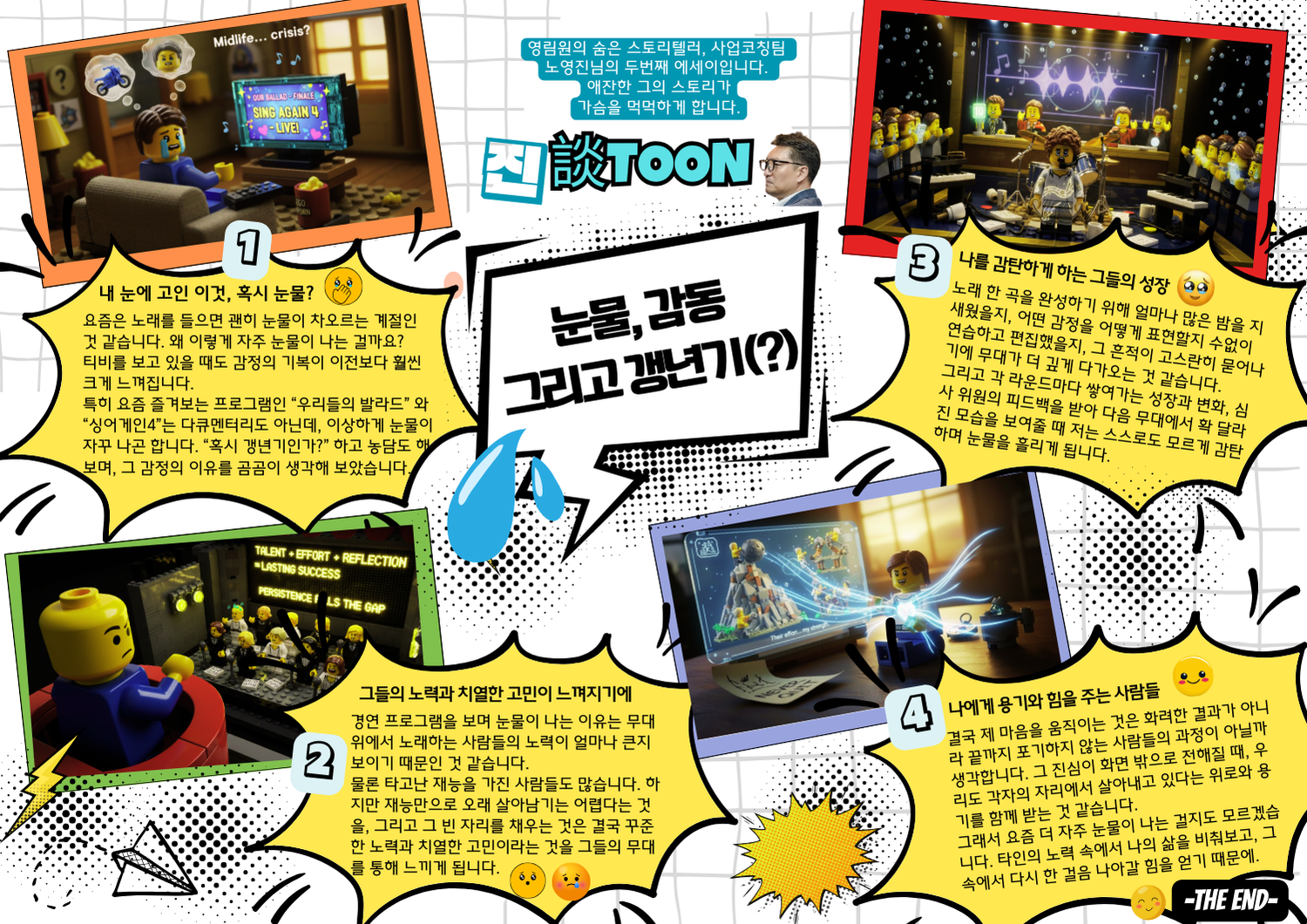 사업코칭팀 노영진 님의 두 번째 에세이, ‘진談TOON’은 경연 프로그램을 보며 흘리는 눈물에 대한 이야기입니다. 노래 한 곡을 위해 밤새 고민하고 연습했을 출연자들의 흔적이 보이기에, 그들의 성장이 더욱 깊게 다가온다는 고백입니다.