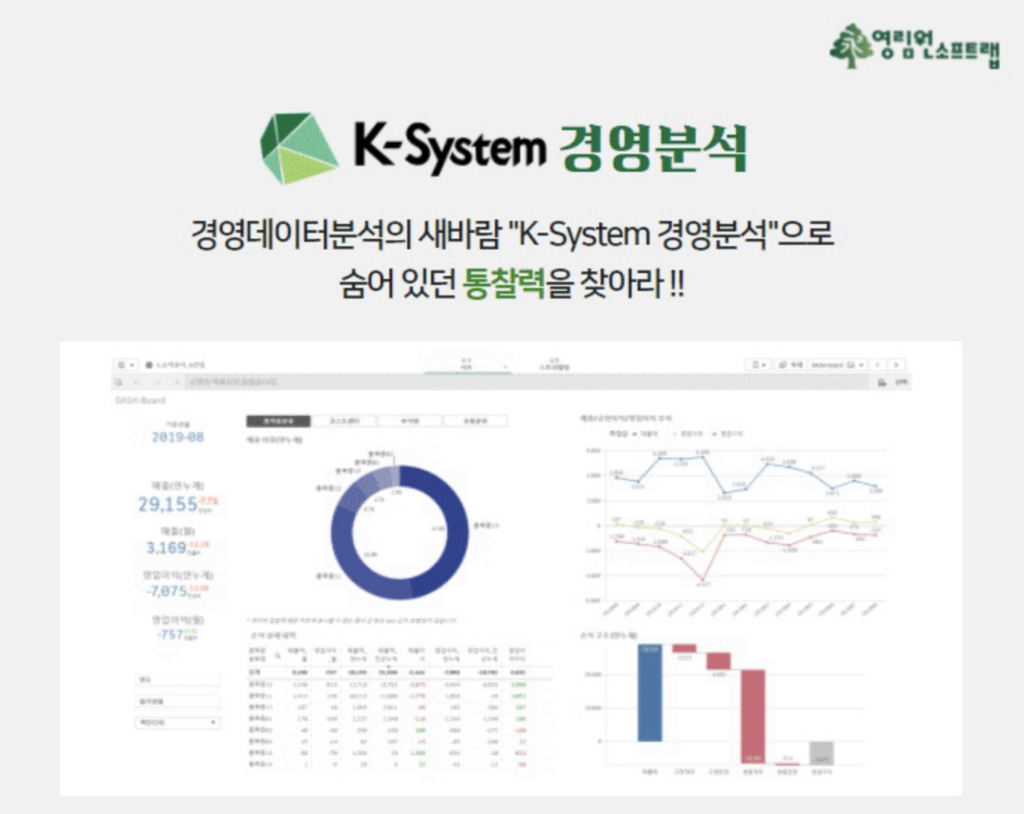 고객기업의 경영수단으로서의 기업통합정보시스템, ERP 를 고집한 영림원소프트랩이 고객의 숨어있는 데이터를 분석하여 새로운 통찰력을 제공하여 경영에 새바람을 불어넣고 있다. K-System 경영분석 패키지는 세계 1위 BI 분석도구인 Qlik Sense 를 활용하여 ERP 시스템의…
