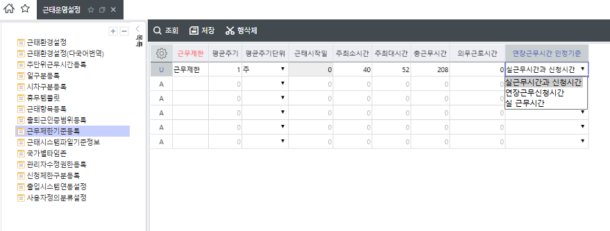 [근태운영설정]등록 화면에서 근무제한 주 최소시간과 주 최대시간을 설정합니다.
