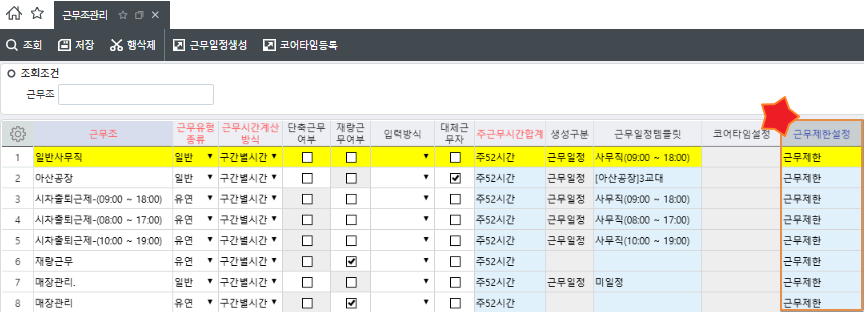 [근무조관리] 화면에서 근무제한설정을 근무조마다 다르게 설정할 수도 있습니다.