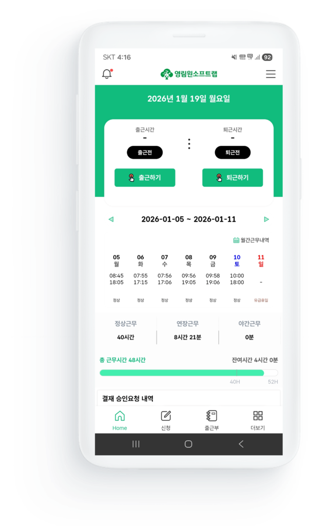 사원분들은 에버타임 모바일앱 홈화면에서 근무 총시간을 확인할 수 있습니다.