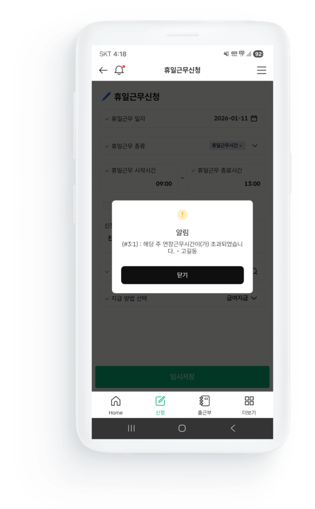 에버타임 모바일앱 [연장근무신청] 또는 [휴일근무신청] 화면에서 근무신청 시 52시간을 초과하는 경우 알림메세지가 발생하면서 근무신청이 통제됩니다.
