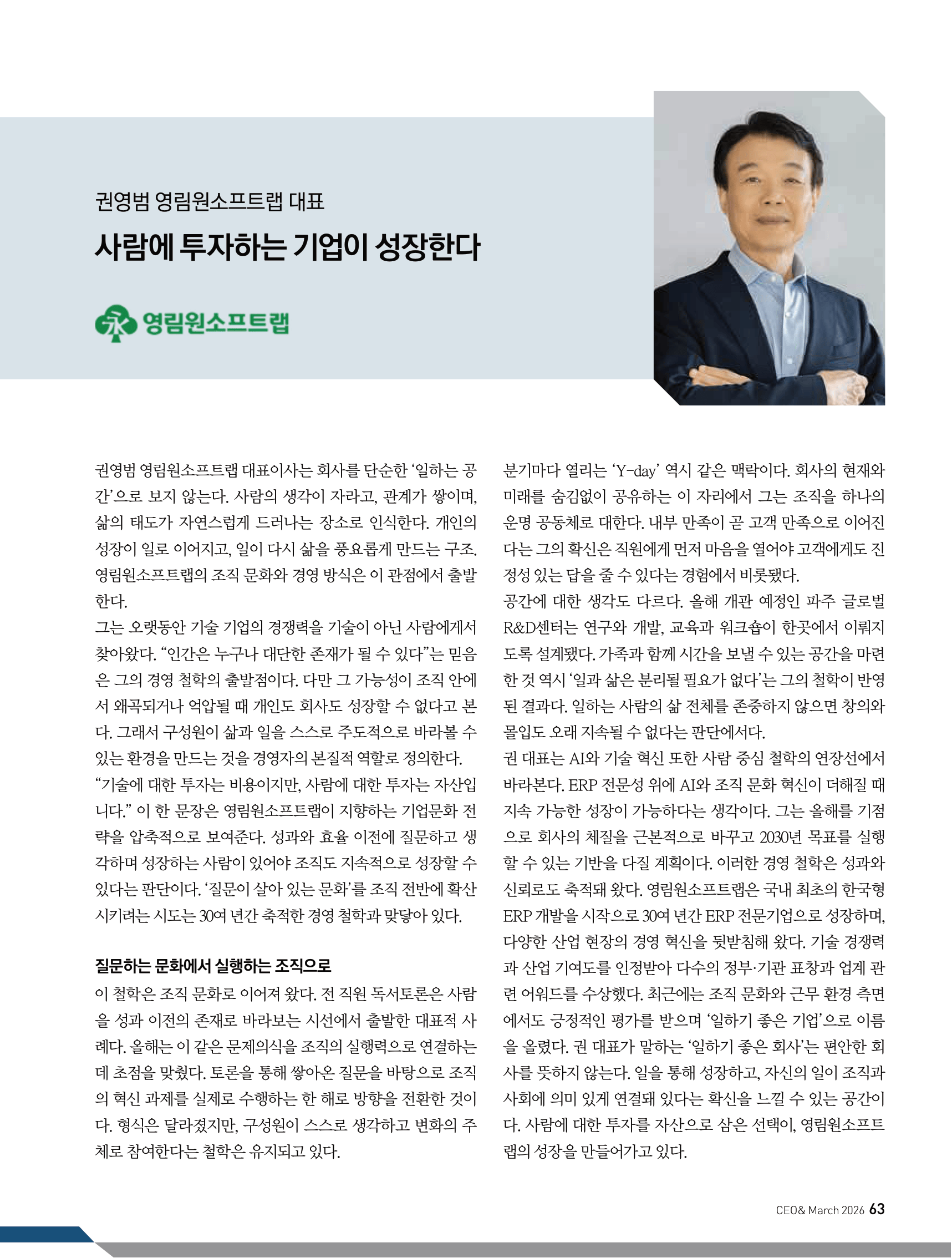 [월간CEO] 권영범 영림원소프트랩 대표 “사람에 투자하는 기업이 성장한다” 2026. 03. 19 영림원 소식 영림원소프트랩이 월간 CEO 2026년 3월호에 소개되었습니다. 이번 기사에는 ‘사람에 투자하는 기업이 성장한다’는 권영범 대표의 경영 철학과질문하는 문화, 실행하는 조직, 그리고 사람 중심의 기업문화에 대한 이야기가 담겼습니다.영림원소프트랩이 지향하는 성장의 방향을 함께 만나보실 수 있습니다 🙂 Share:
