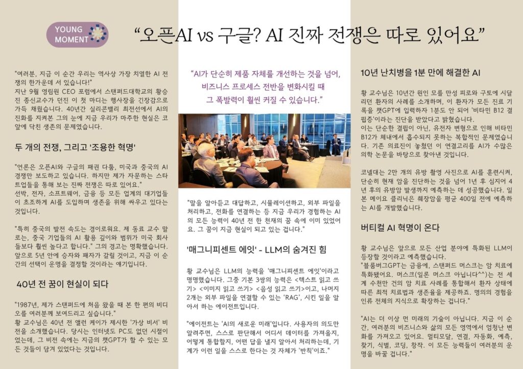 ” 오픈AI vs 구글? AI 진짜 전쟁은 따로 있어요” 실리콘밸리 최전선에서 본 AI 전쟁 영림원 CEO 포럼 연사로 나선 황승진 스탠퍼드대학교 종신교수가 전하는 AI 시대의 현실과 미래. 그는 언론에 비치는 빅테크…