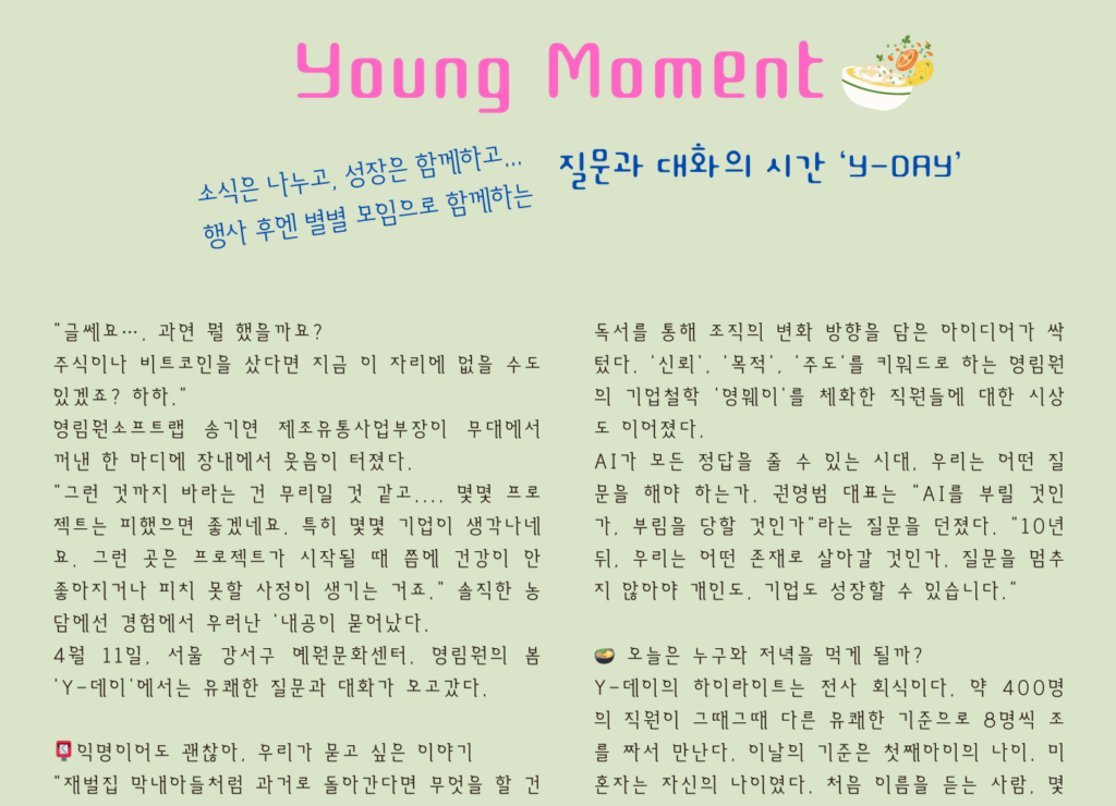‘증미역 이야기 맛집’이 문을 열었습니다. 영림원소프트랩의 문화 소식지 1호인 2025년 4월 ‘Young.April’ 에 담긴 [Young Moment] 글입니다. 📮질문과 대화의 시간 ‘Y-Day’ 소식은 나누고, 성장은 함께하고.~ 행사 후엔 별별 모임으로 함께하고~ …