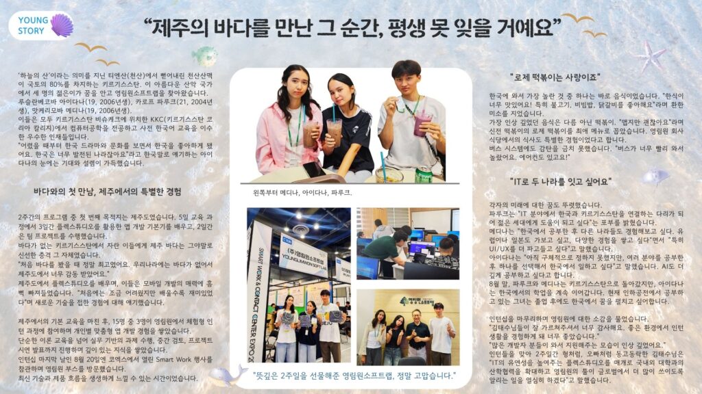 “제주의 바다를 만난 그 순간, 평생 못 잊을 거예요” 키르기스스탄에서 온 세 명의 젊은 인재, 루슬란베코바 아이다나(19), 카로프 파루크(21), 맛케리모바 메디나(19)가 영림원소프트랩을 찾았습니다. 이들은 키르기스스탄 코리아 칼리지(KKC)에서 컴퓨터공학을 전공하고 한국어 교육을…