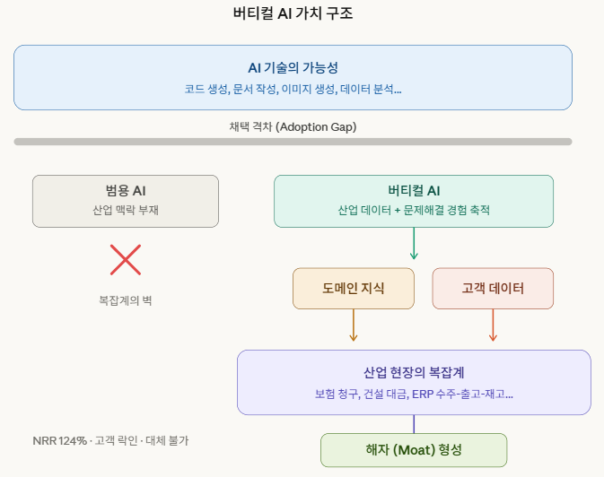AI 시대에 진정한 해자는 산업 현장의 복잡성을 이해하고, 그 이해를 데이터로 축적하고, 고객과 함께 문제를 풀어온 ‘축적의 시간’이다. 경제성과 효율성을 앞세운 단순 기능형 소프트웨어는 도태되고, 산업의 복잡계를 끌어안으면서 작동방식을 재설계하는 기업은 승리할 것이다. 바야흐로 버티컬의 역습이 시작되었다.