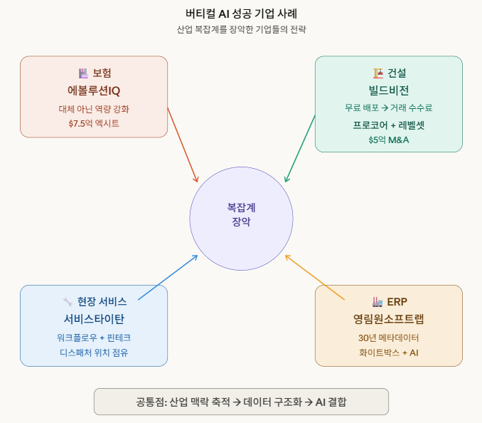 보험 청구 처리 분야의 에볼루션IQ(EvolutionIQ)는 담당자를 대체하는 대신 그들의 역량을 극대화하는 ‘지렛대’ 역할을 택했다. 의료 기록과 법률 문서 등 범용 AI가 이해하기 힘든 비정형 데이터를 구조화하여 위험 점수를 산출했다. 보험사는 담당자가 몇 퍼센트만 더 정확하게 판단해도 보험사에는 수억 달러의 이익이 돌아간다. 이들은 기존 핵심 시스템을 교체하지 않고 그 위에 얹히는 방식을 택해 통합의 난관을 피하며 지난해 7억 5,000만 달러 규모의 엑시트를 달성했다.