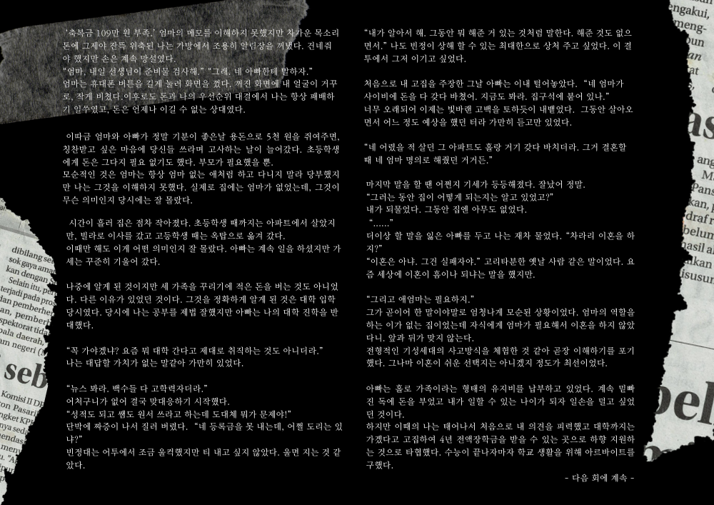 “엄마, 내일 선생님이 준비물 검사해.” “그래. 네 아빠한테 말하자.” 엄마는 휴대폰 버튼을 길게 눌러 화면을 껐다. 꺼진 화면에 내 얼굴이 거꾸로, 작게 비쳤다. 이후로도 돈과 나의 우선순위 대결에서 나는 항상 패배하기 일쑤였고, 돈은 언제나 이길 수 없는 상대였다.