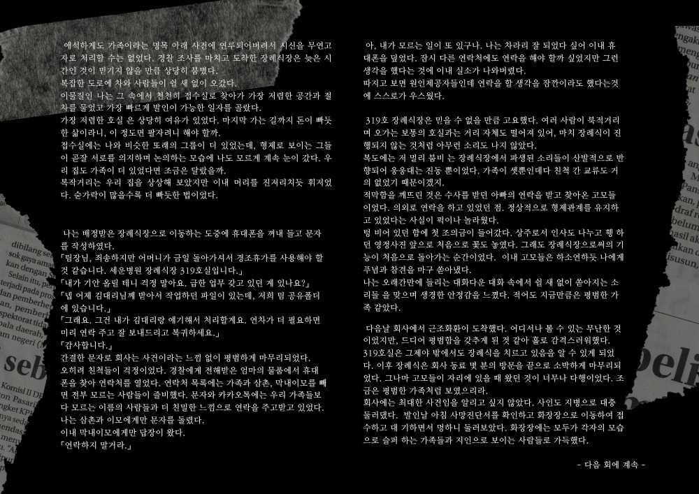 319호 장례식장은 믿을 수 없을 만큼 고요했다. 여러 사람이 북적거리 며 오가는 보통의 호실과는 거리 자체도 떨어져 있어, 마치 장례식이 진 행되지 않는 것처럼 아무런 소리도 나지 않았다.
