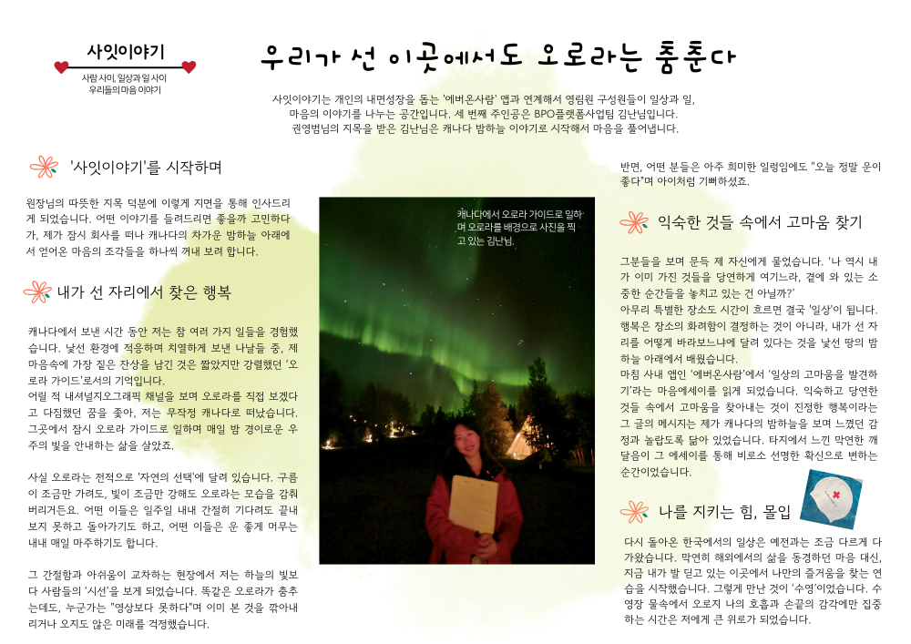 BPO플랫폼사업팀 김난 님은 캐나다의 차가운 밤하늘 아래서 얻어온 마음의 조각들을 전합니다.