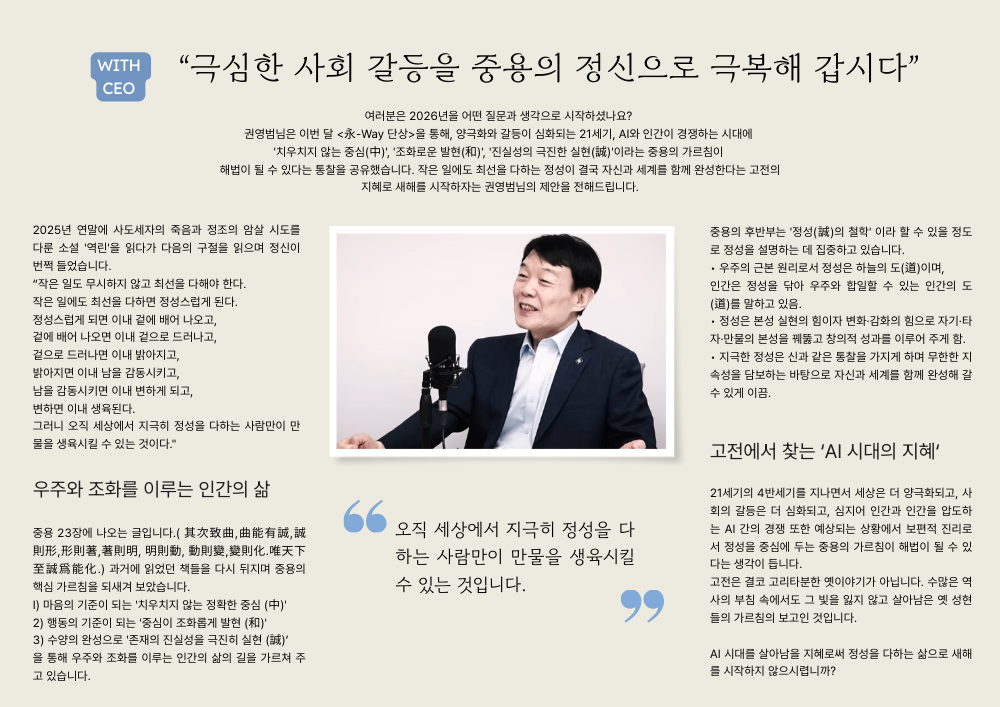 작은 일도 무시하지 않고 최선을 다하는 ‘정성(誠)’만이 결국 세상을 변화시킨다는 철학을 되새기며, 갈등이 심화되는 AI 시대일수록 치우치지 않는 정확한 중심(中)을 잡는 것이 해법임을 강조했습니다.